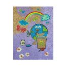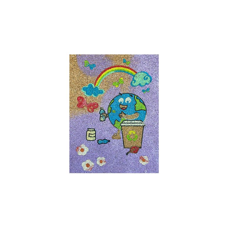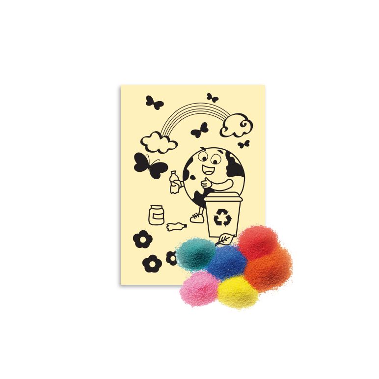 Realizat din carton adeziv. Setul complet conține o planșă de desen, 8 pliculețe cu nisip colorat (8 culori), un pins pentru dezlipit ușor zonele de colorat și o folie de protecție.