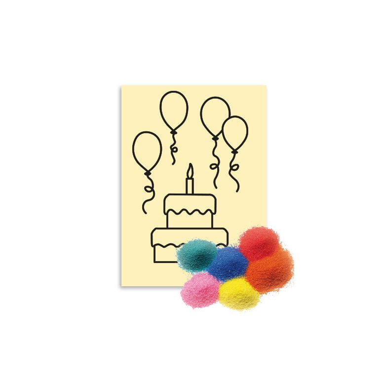 Realizat din carton adeziv. Setul complet conține o planșă de desen, 8 pliculețe cu nisip colorat (8 culori), un pins pentru dezlipit ușor zonele de colorat și o folie de protecție.