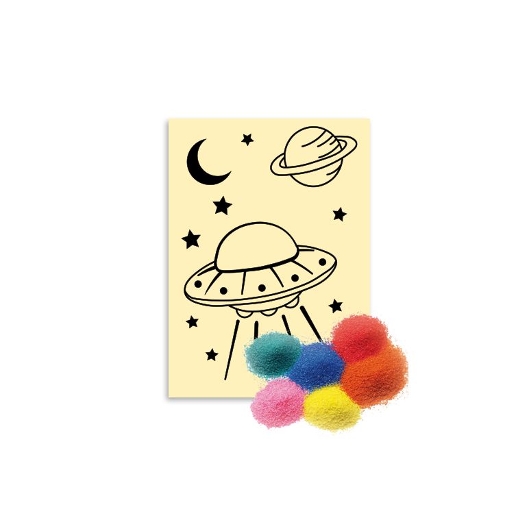Realizat din carton adeziv. Setul complet conține o planșă de desen, 8 pliculețe cu nisip colorat (8 culori), un pins pentru dezlipit ușor zonele de colorat și o folie de protecție.